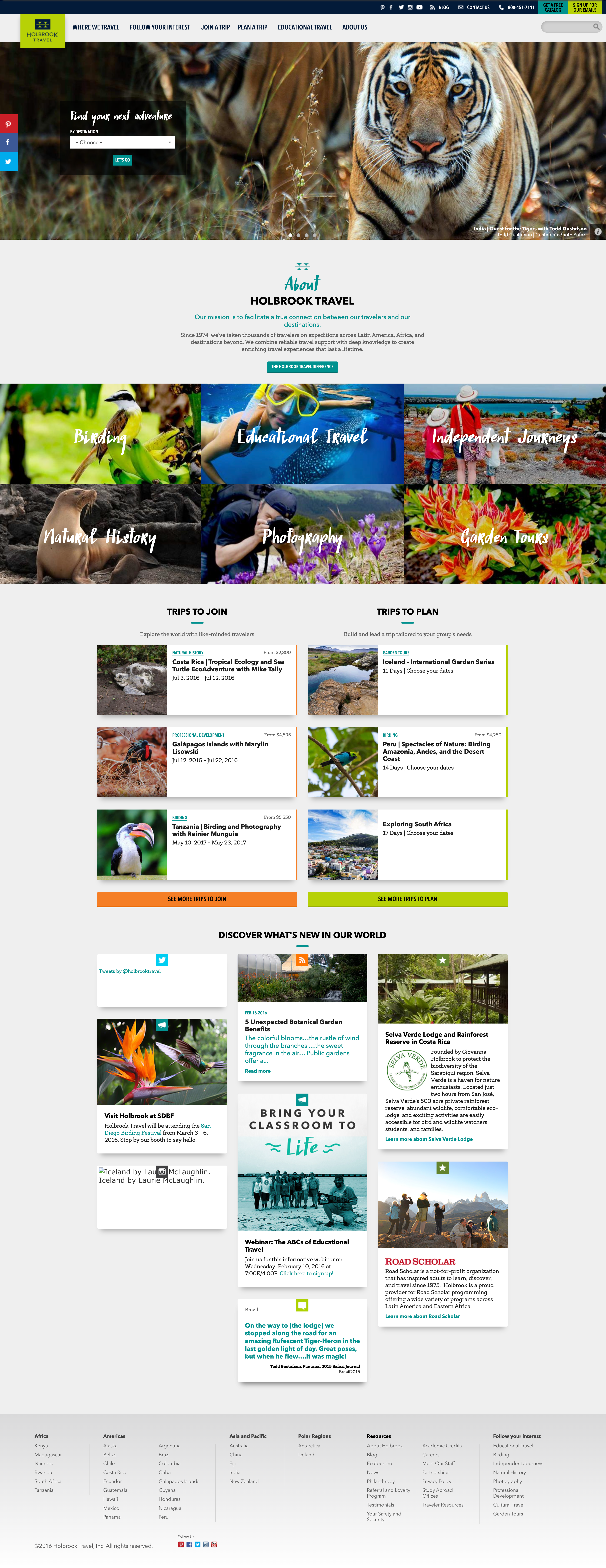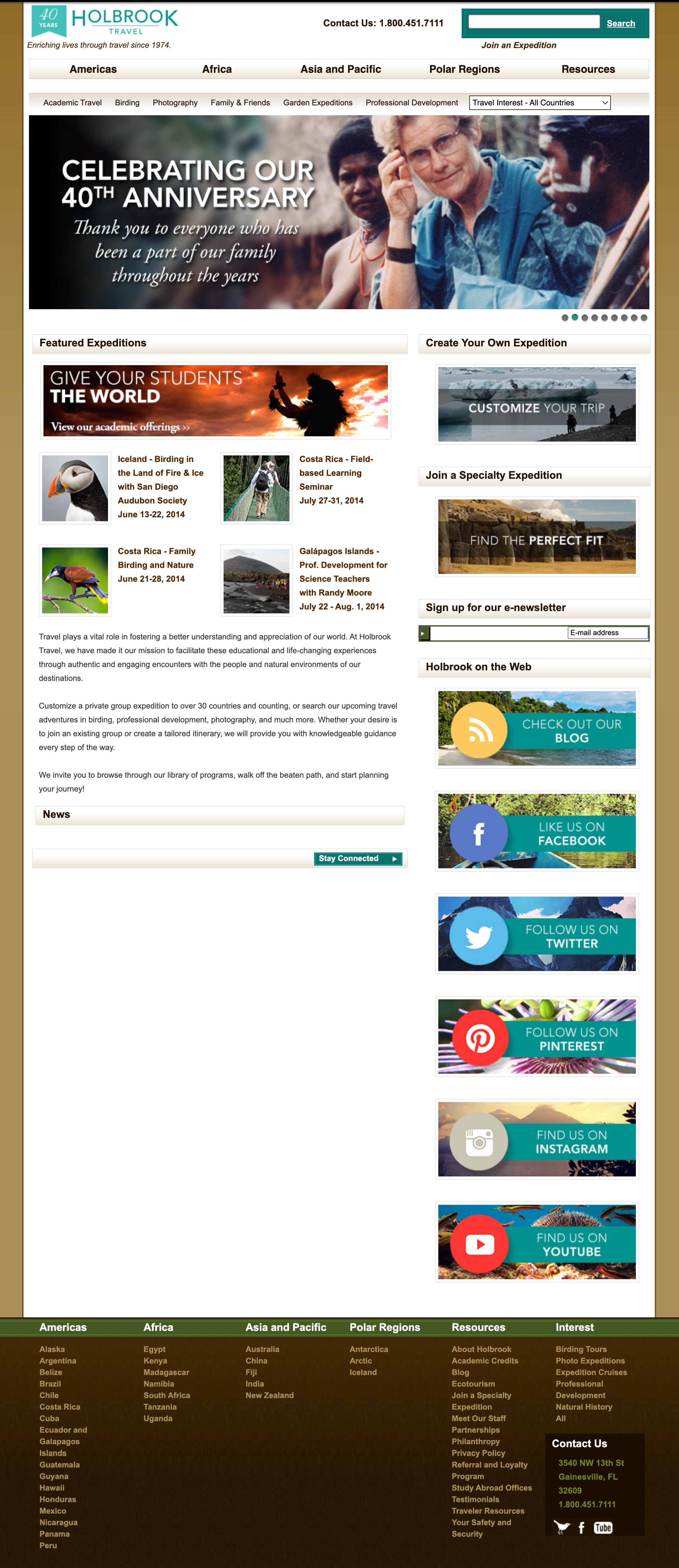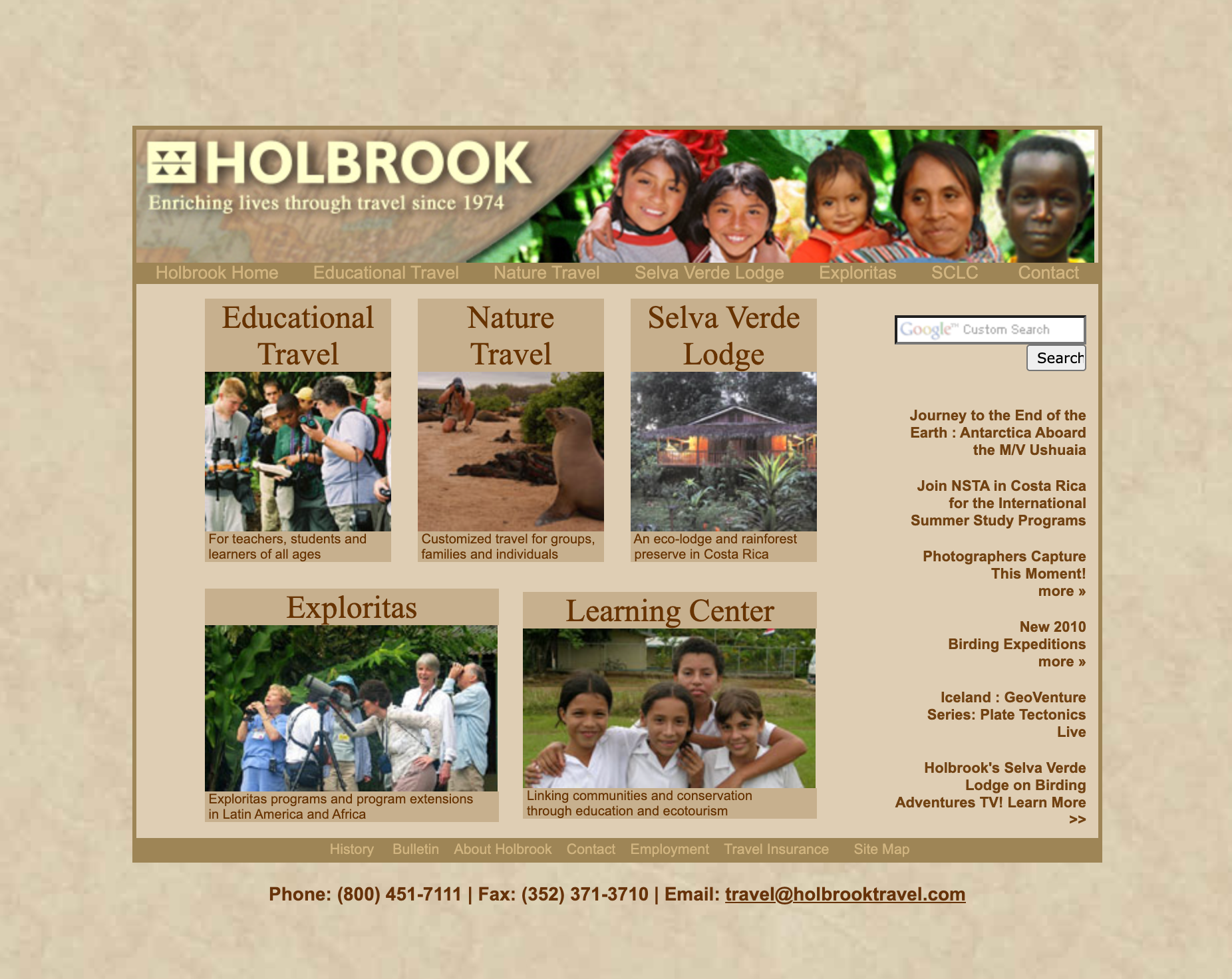 Holbrook Travel specializes in educational and natural history travel — group tours and academic expeditions to the Amazon, Galápagos, Costa Rica, Cuba, and Africa for an audience of natural history enthusiasts, birders, educators, students, and scientists. As Creative Director and Marketing Coordinator, I led all visual and marketing output: the website through multiple redesign cycles, all print and digital marketing collateral, and the brand's visual identity as it evolved.