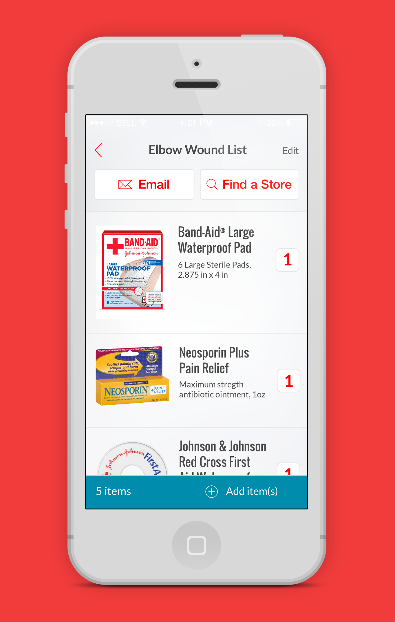 The client wanted to give basic wound care guidance to customers using their products, make it easy to manage first aid supplies, and help users locate nearby stores that stocked what they needed.