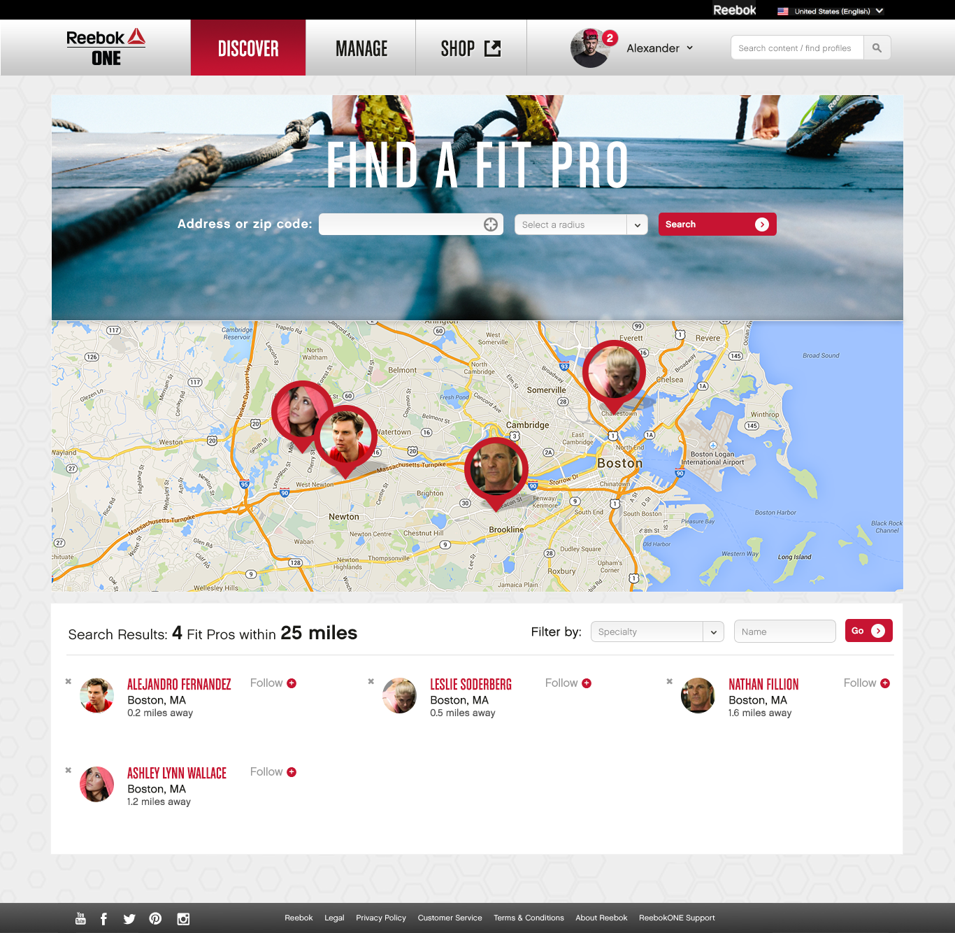 Designed the social content dashboard, group activity flows, and a location-based tool for users to find fitness professionals by specialty — making the platform as useful for discovery as for content creation.
