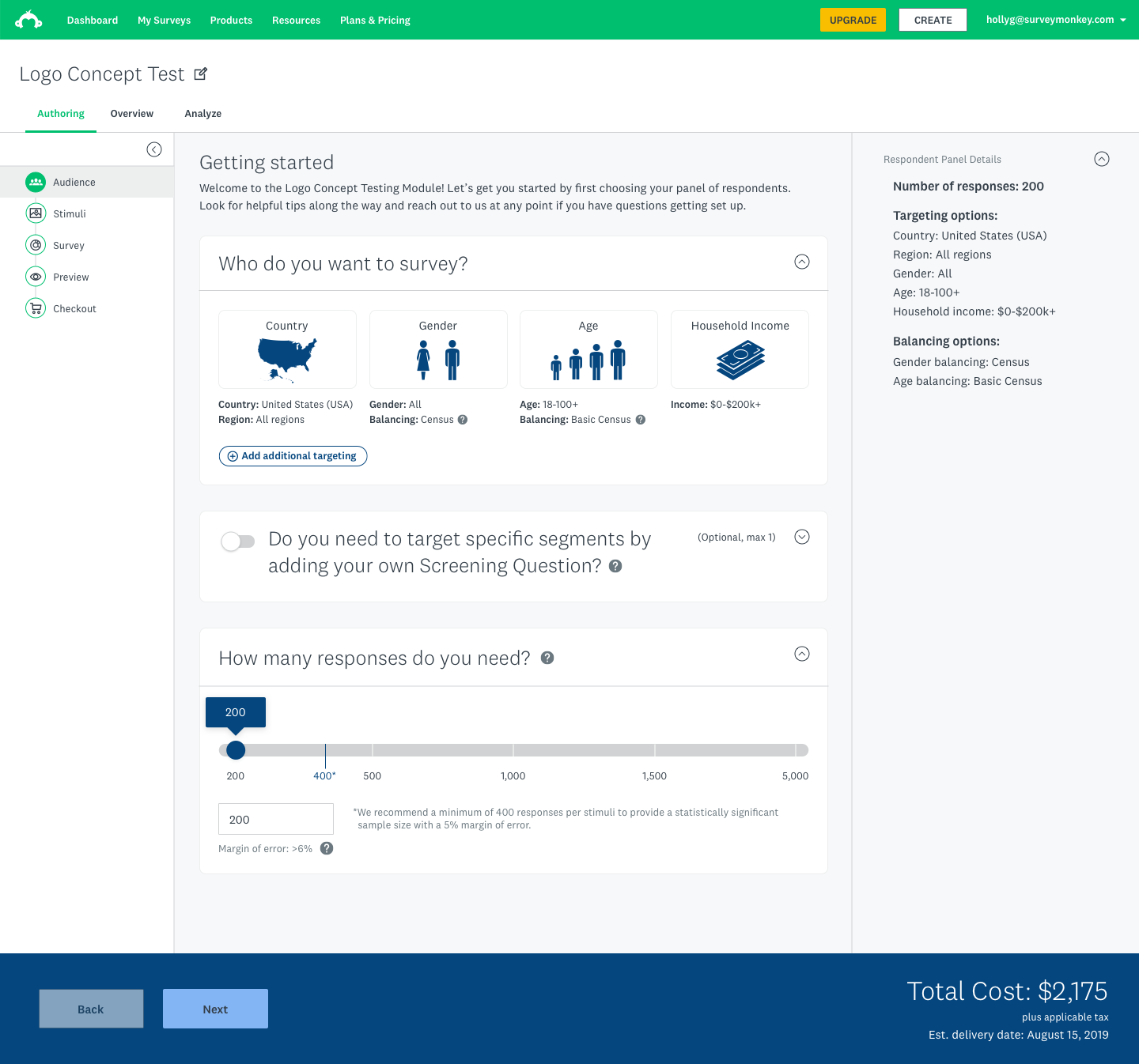 This portion included target demographic selection, screening questions, and setting the number responses they'll need. The dark blue bar at the bottom keeps a running total of the project.