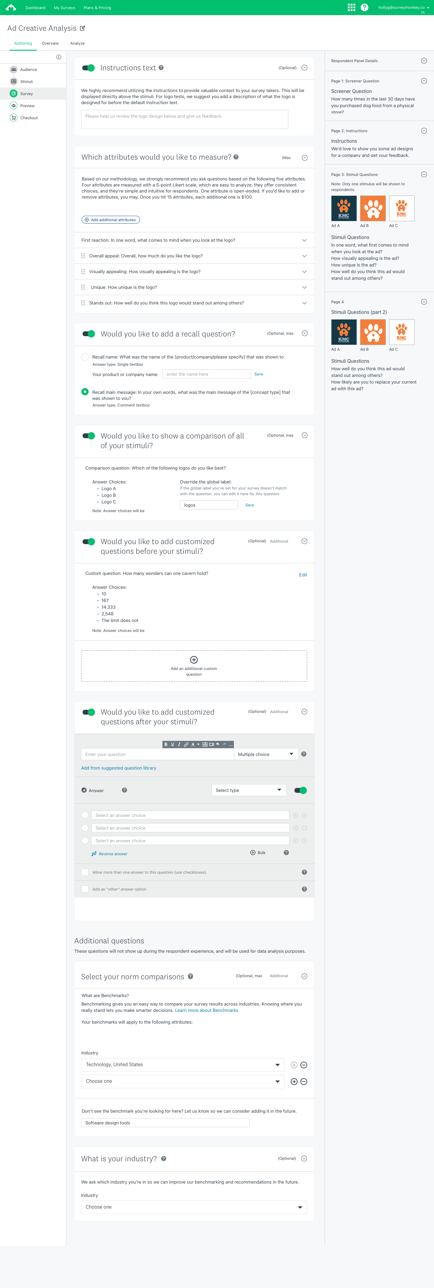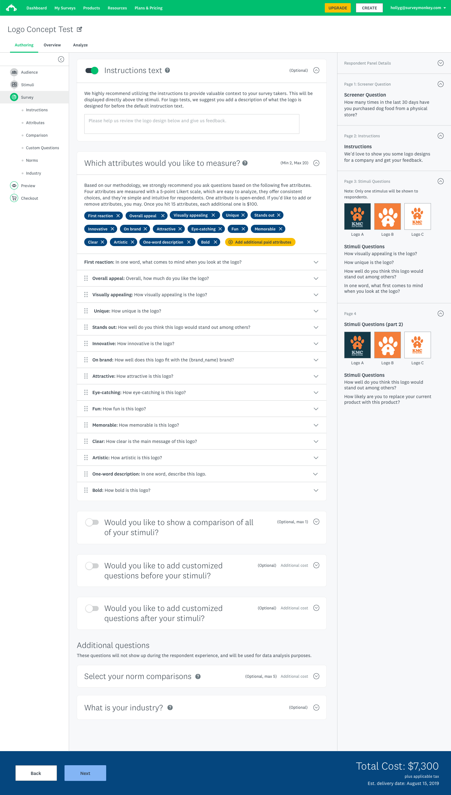 During the survey step, users can generate instructions for their respondents, select the attributes they want to measure, choose if they want to show a comparison of all stimuli, and whether they want to add custom questions before or after their stimuli are shown.