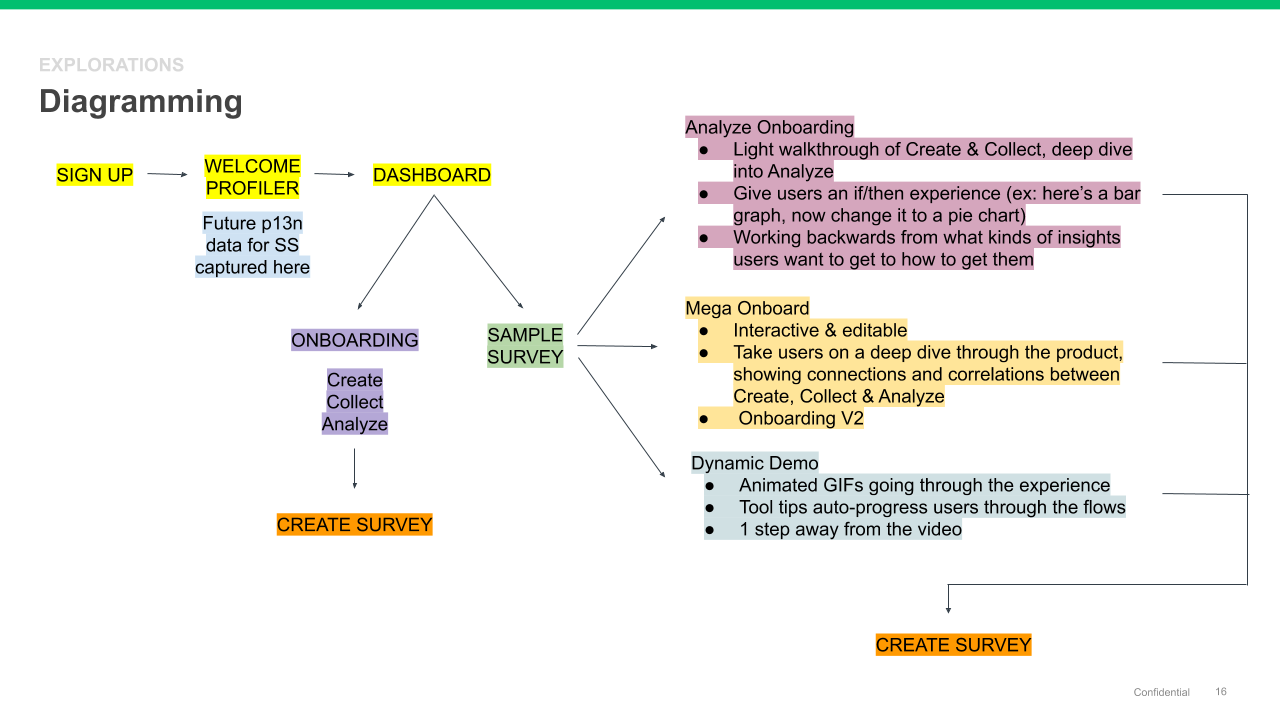 - How can the Sample Survey and Onboarding flows leverage each other to create a richer experience when combined but still stand alone when necessary?