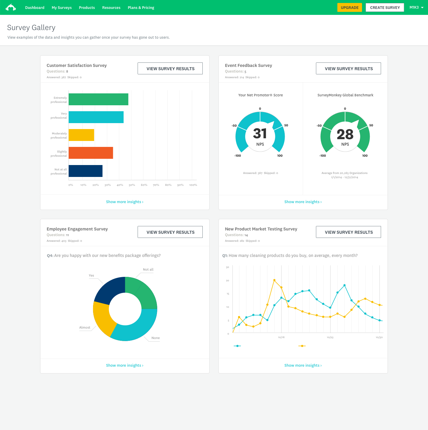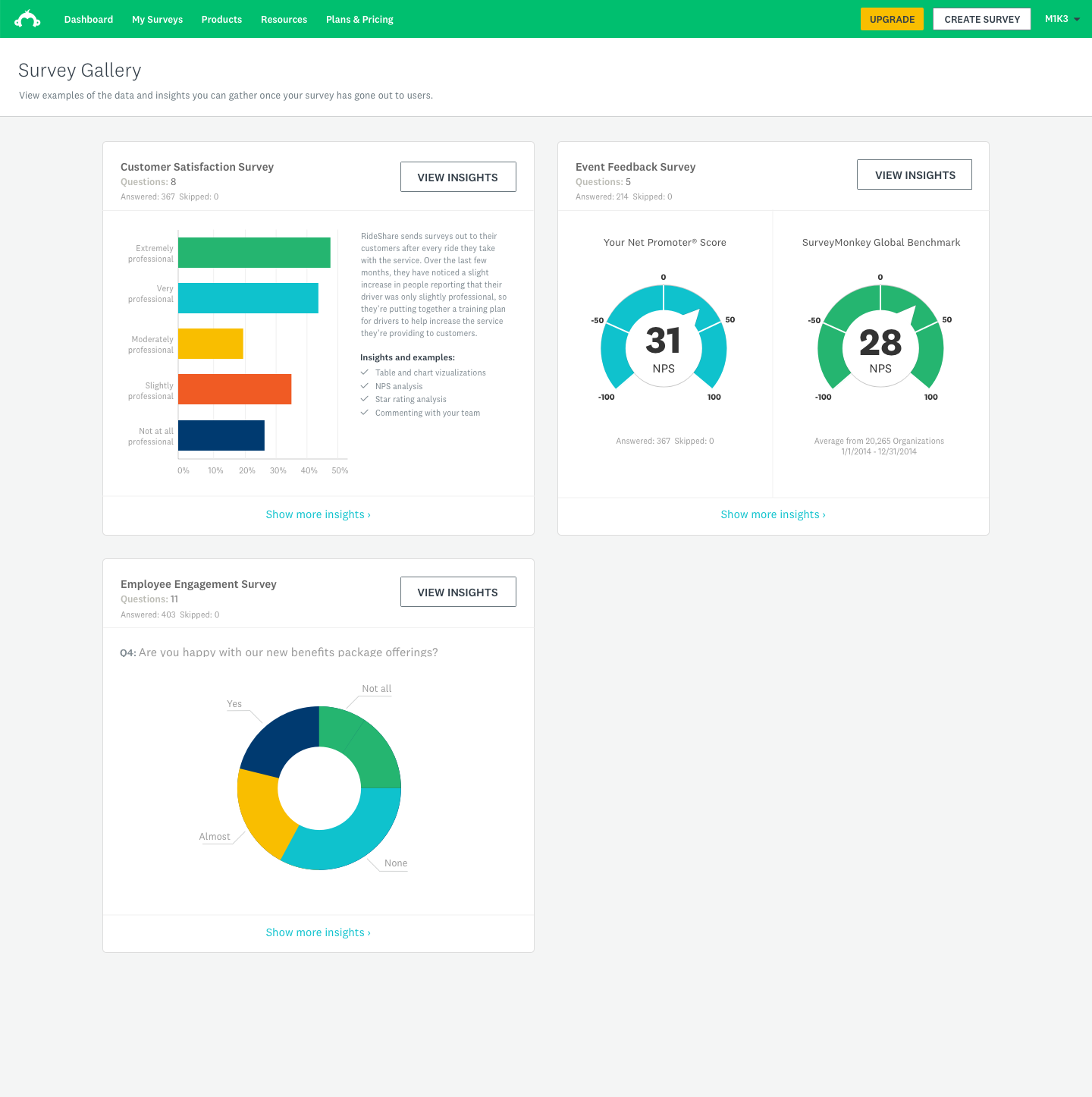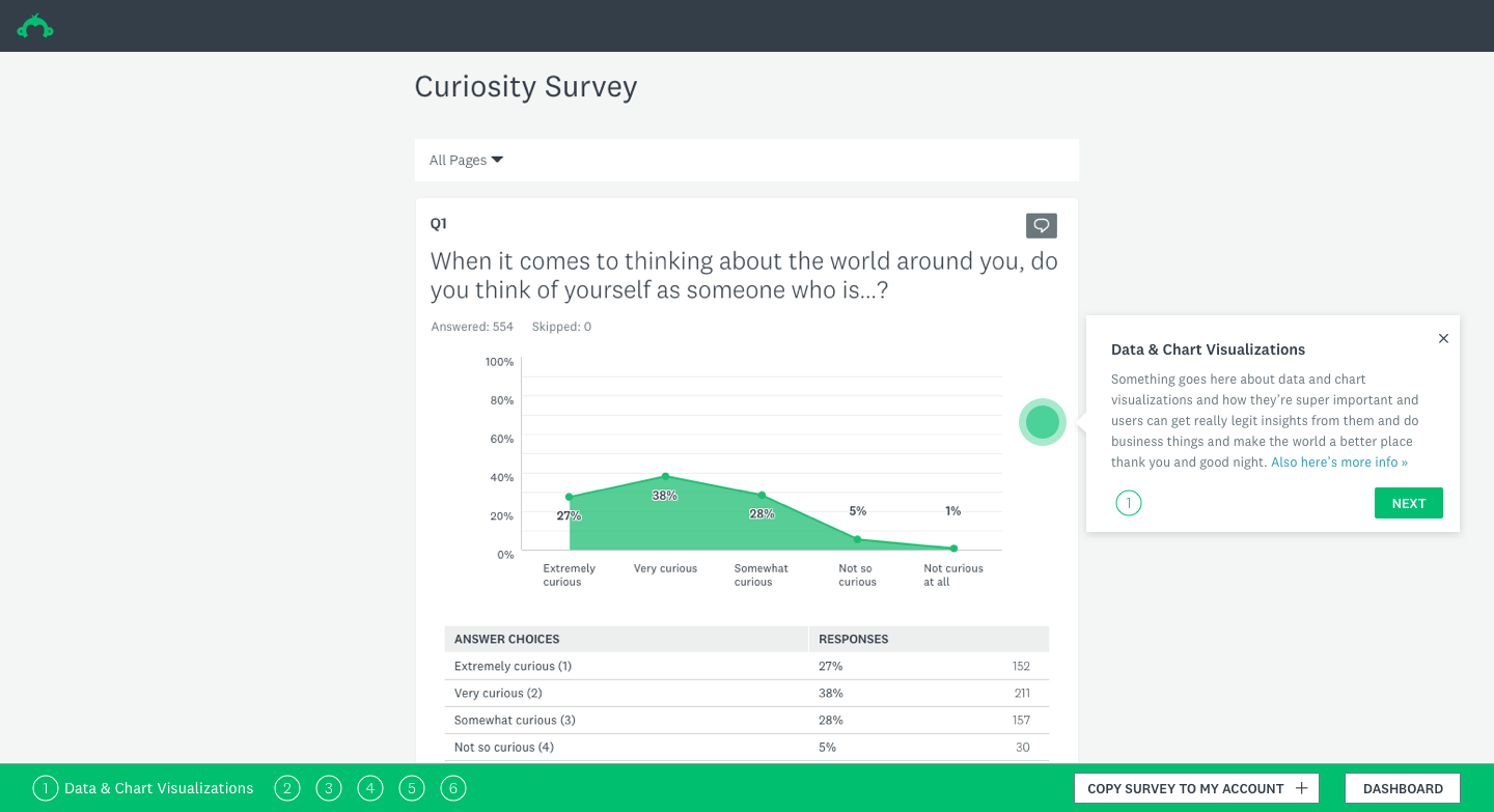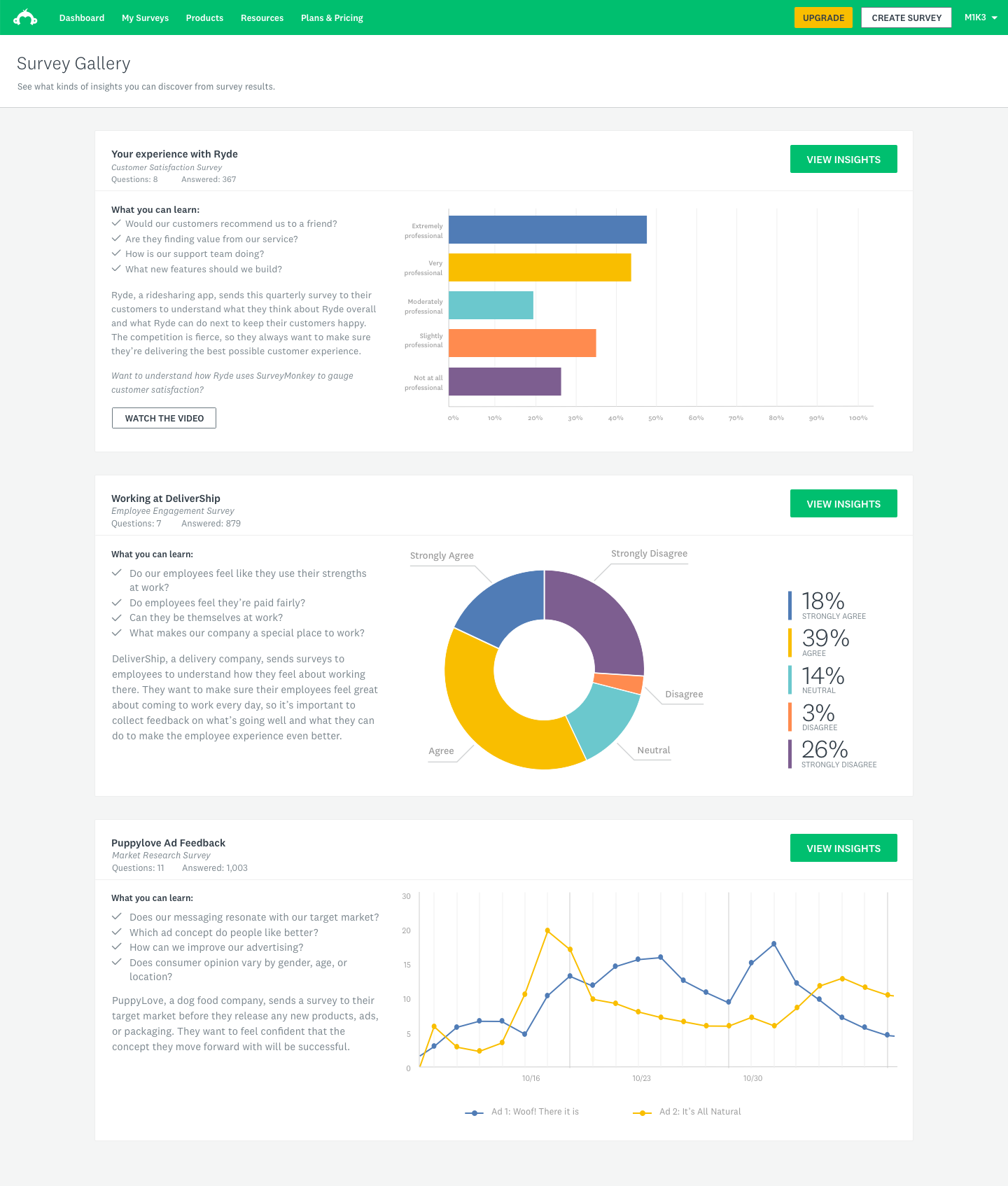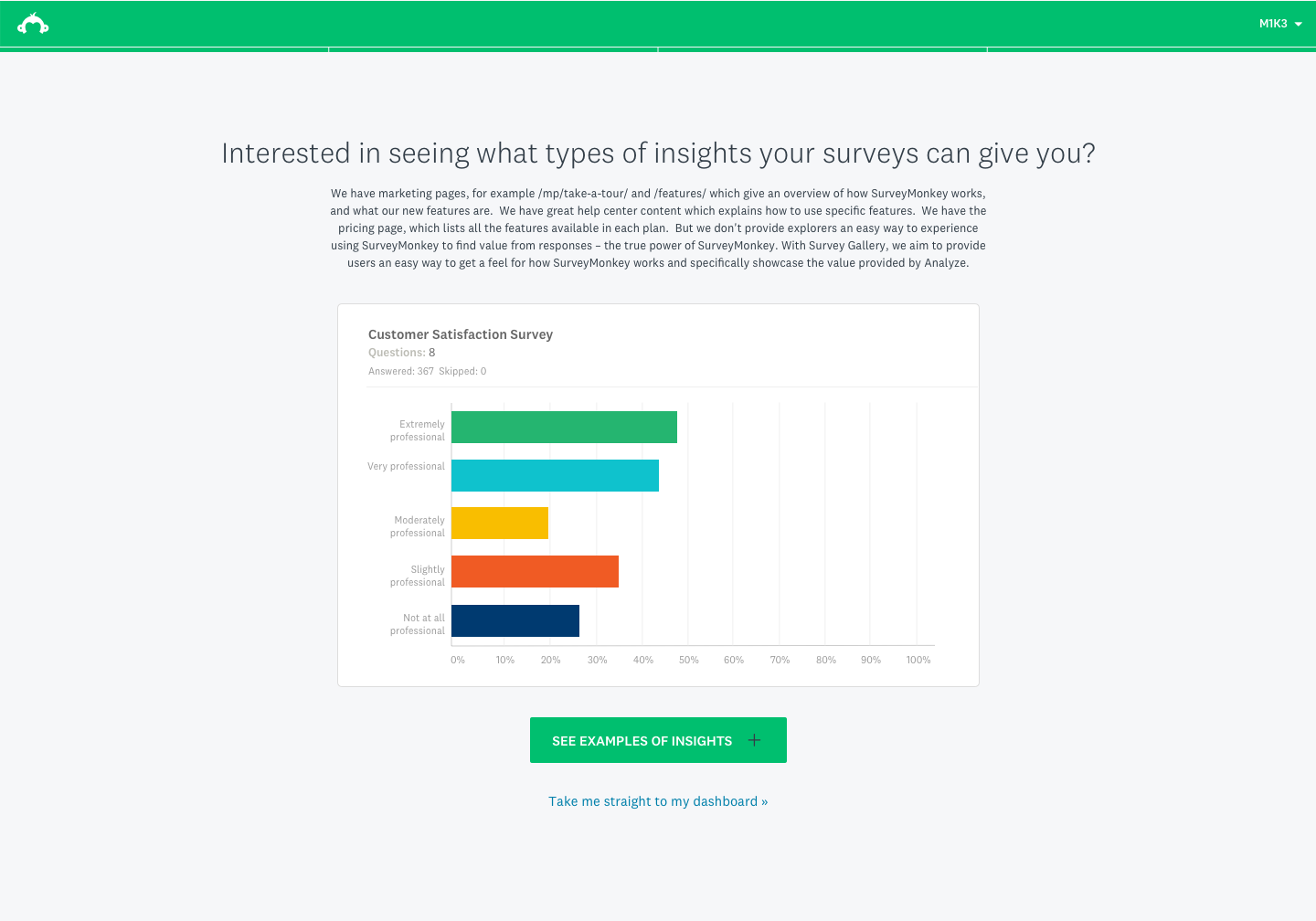As our product, we wanted to use the Survey Gallery to display curated survey examples to users who were logged in or browsing the dashboard. This would allow users to get a glimpse of the great things they can do with the SurveyMonkey product suite. The ultimate objective of this project was to show users the great summary tables and powerful but simple charts and overall capabilities — essentially, to show as an example of a self-customized survey to give users an idea of how the data looks once they have their survey results ready to enable them to make an impact.