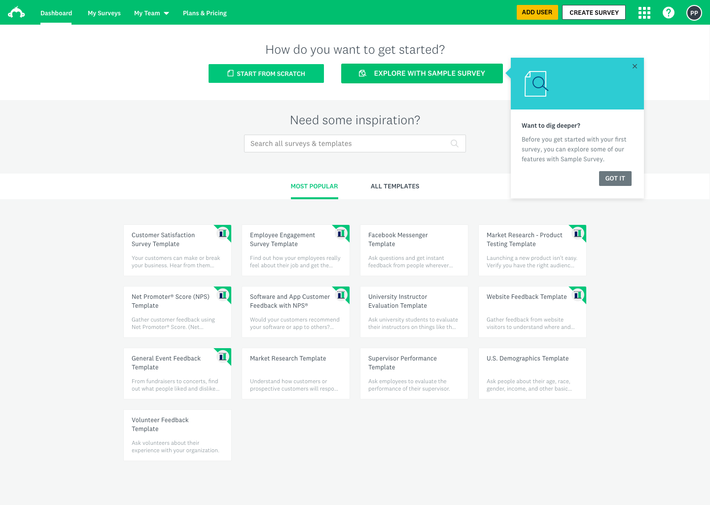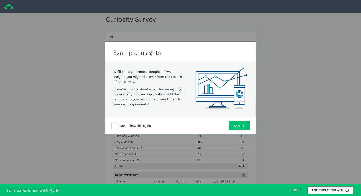 Rather than guiding users toward creation, we shifted focus to creating a curated gallery experience within the dashboard that would let users browse real example surveys with populated results. The gallery would live where users were already spending time — their home dashboard — and offer a low-commitment, high-reward way to understand what the product could do for them.