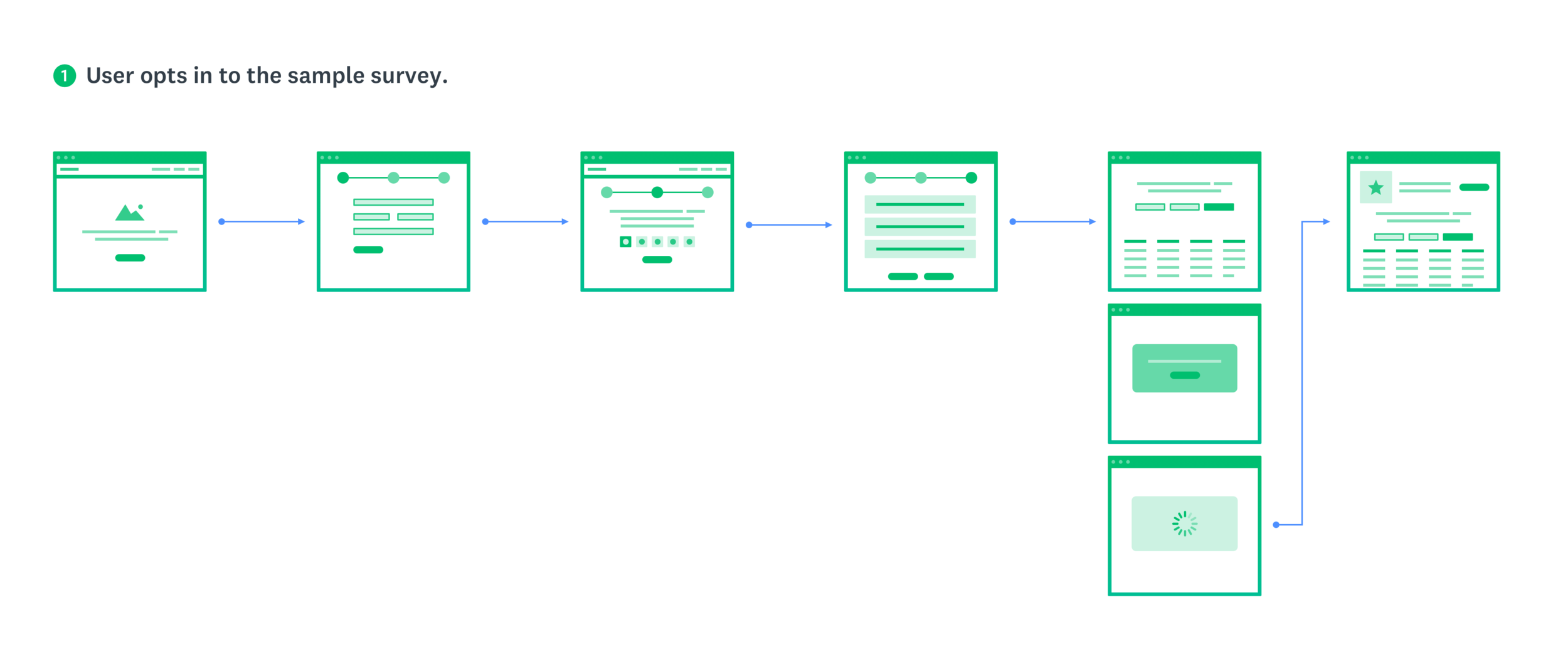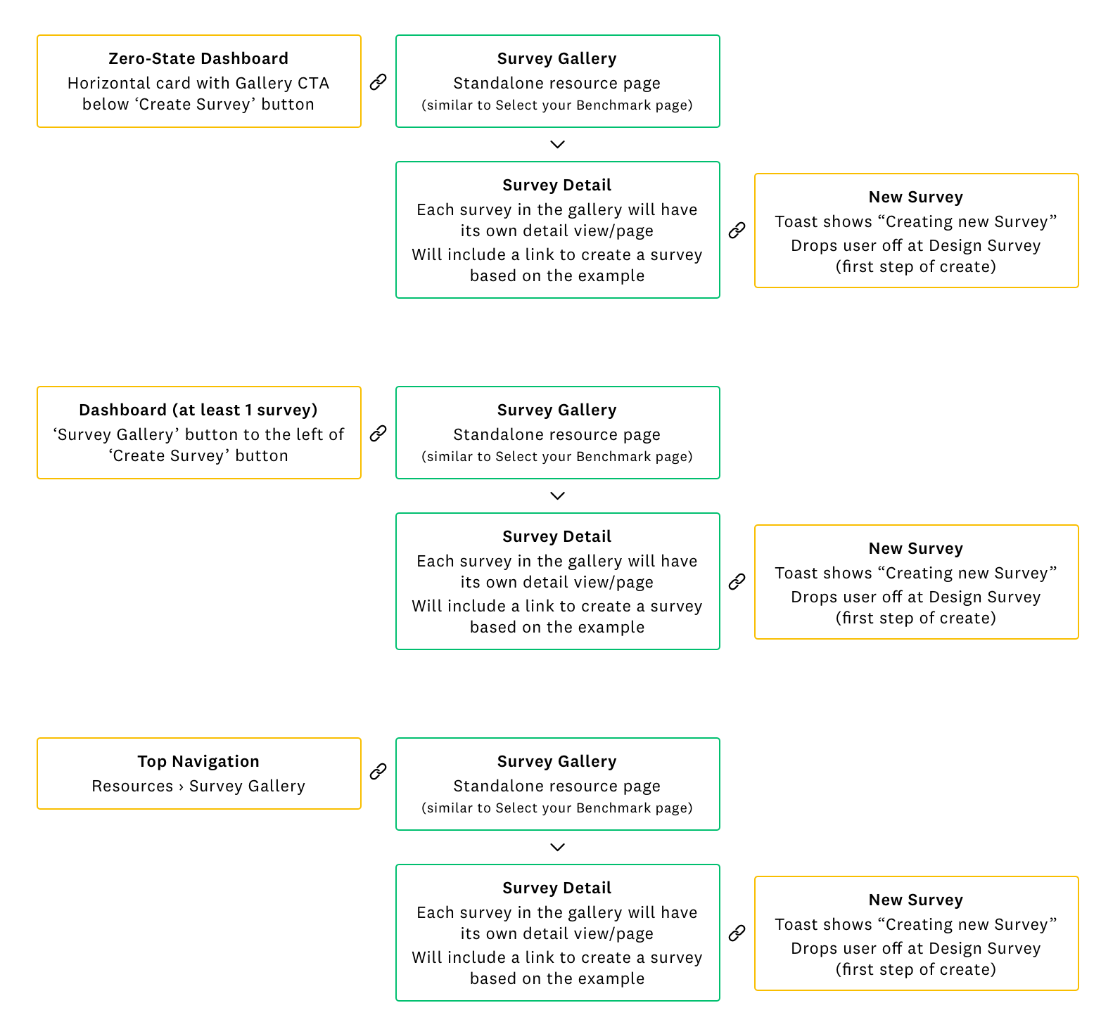 In order to better understand how this experience would work and to get a more comprehensive view of how it would exist within our existing core surveys platform, I led the team in diagramming and looking at the IA options in terms of entry and exit points, as well as how the experience might live within a customer's account.