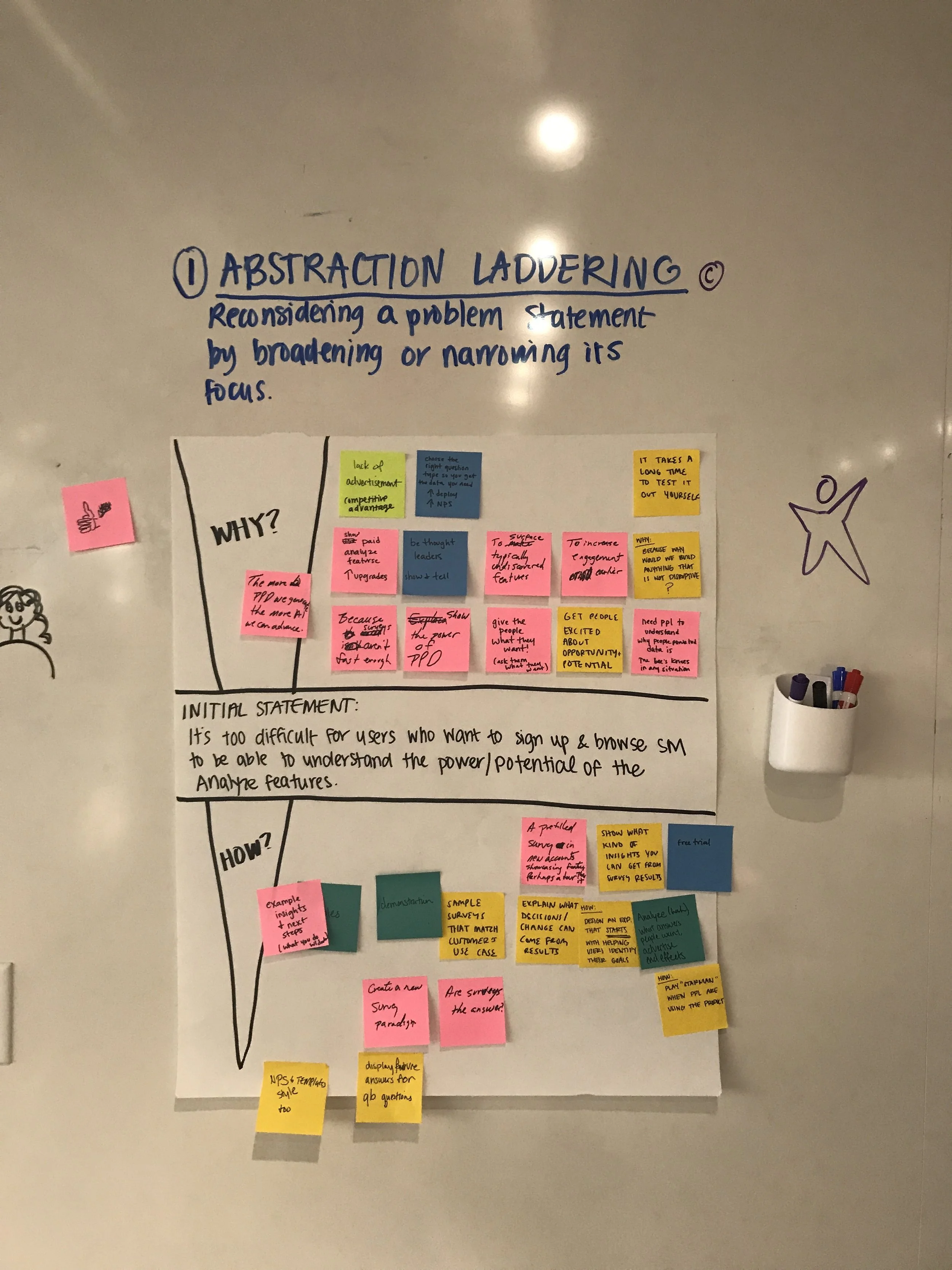 We used abstract laddering to push the team past feature-level thinking. Starting from a concrete product idea, we kept asking 'why does that matter?' until we reached the underlying user value. This helped us separate the what from the why and gave the team a shared language for evaluating ideas against genuine user needs rather than surface-level appeal.