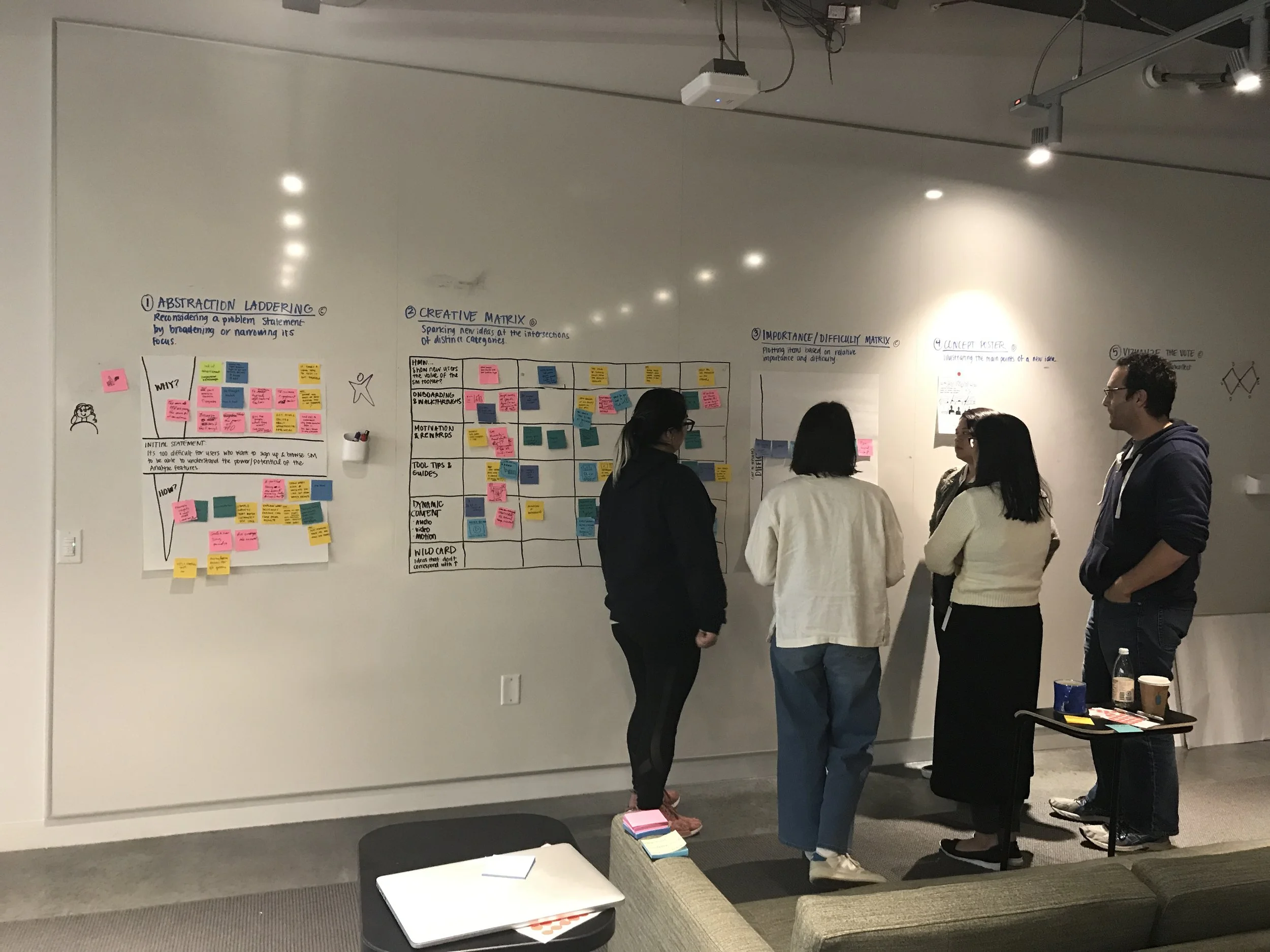 - Design thinking workshops are most valuable when they're structured around genuine alignment problems, not just brainstorming. Having clear frameworks (laddering, creative matrix, prioritization) kept the team from spinning in abstraction.