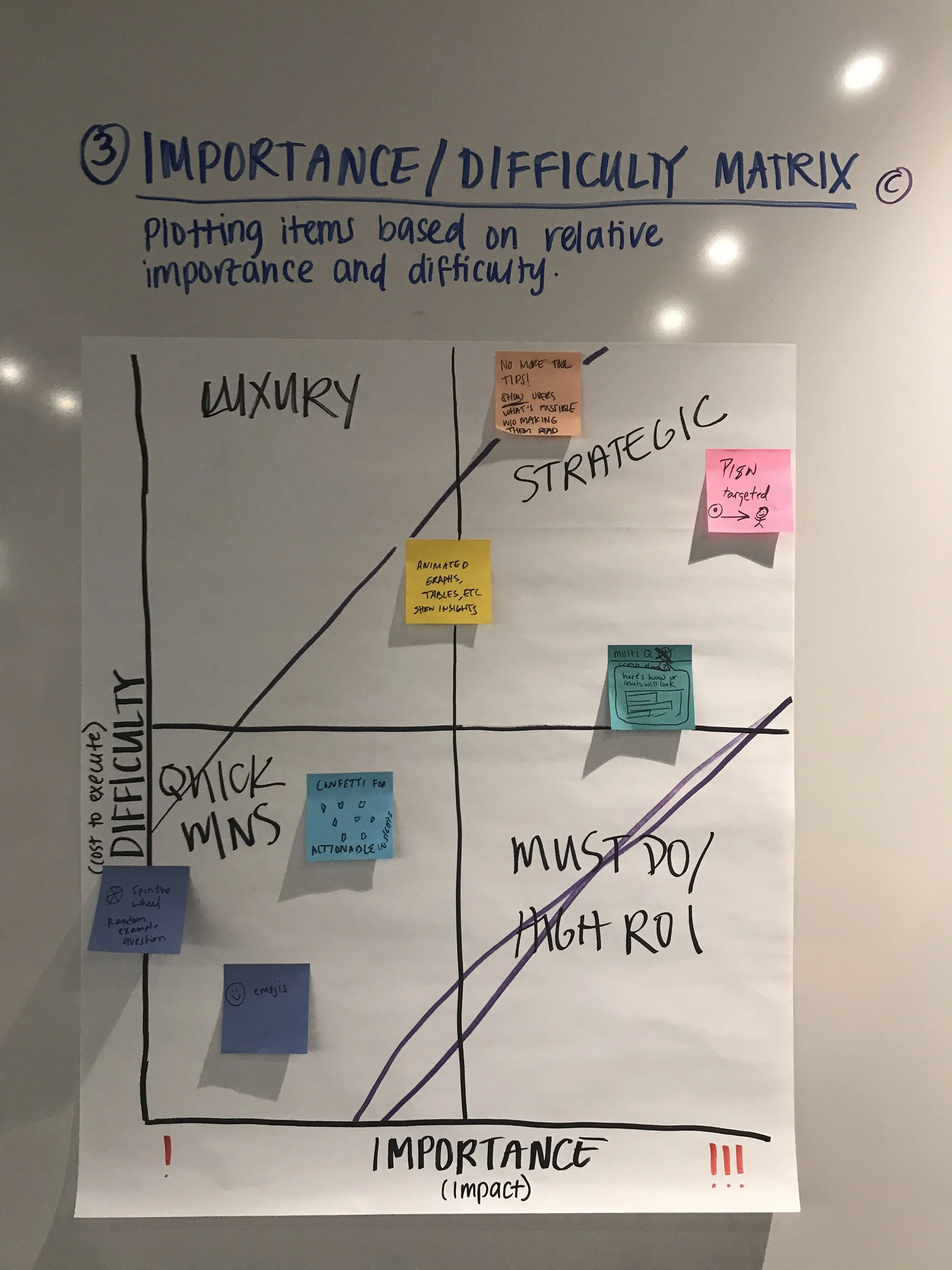 - High ROI zone (low difficulty, high importance): Surface pre-completed survey data to help users understand what's possible