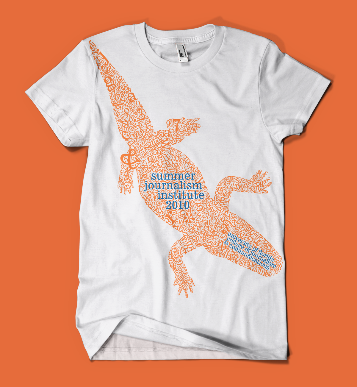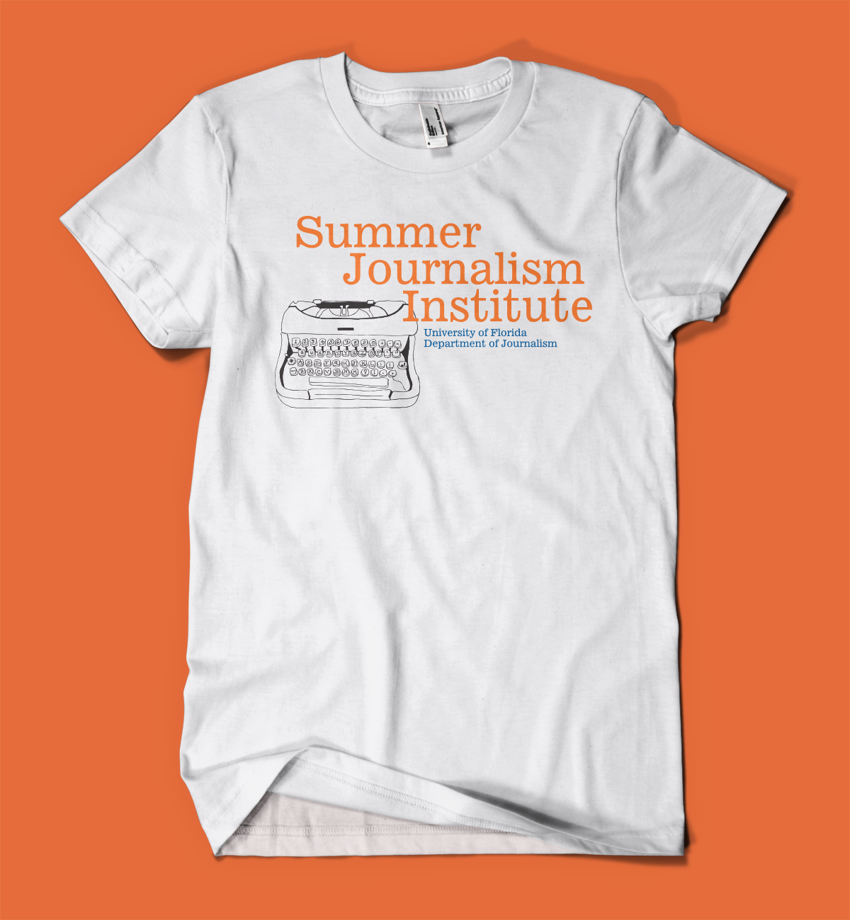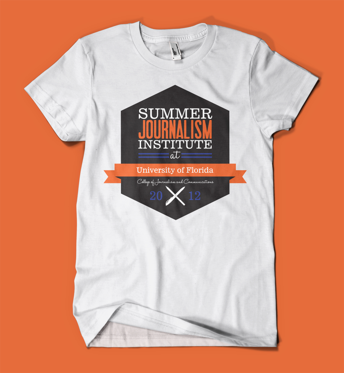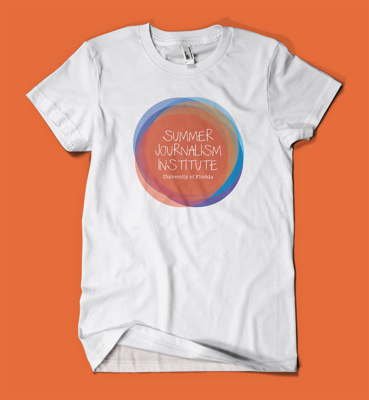 Five years of annual identity systems for the University of Florida's Summer Journalism Institute — an intensive program for high school students interested in journalism, media, and communication. Each year's t-shirt design was the anchor of a small visual system: the same graphic language carried through every camper's ID badge, room door signs, printed programs, and presentation decks used throughout the week. The shirt is what participants take home, but the identity touched everything they experienced while they were there.